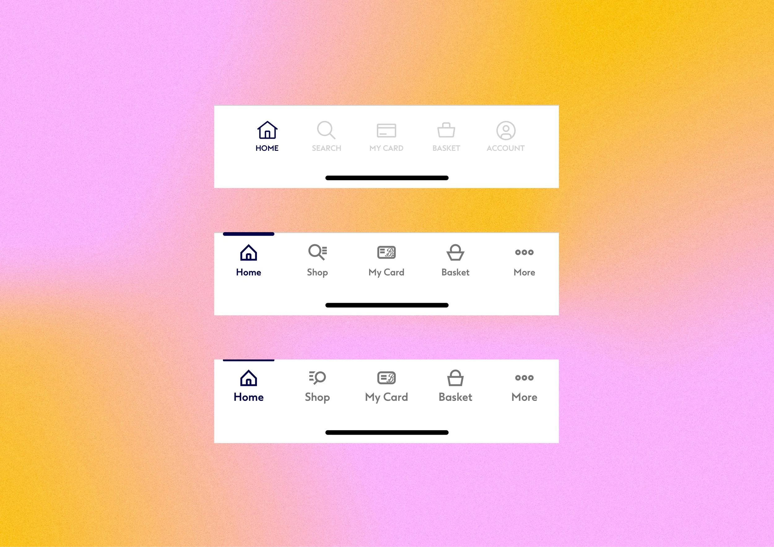 At this stage I had some key assumptions around the design of the bottom navigation, this included; the correct iconography to represent each section, how clearly the selected states were denoted, and whether the correct sections were mapped and in the correct order. In order to validate my decisions it was decided to run four customer tests, each involving eighteen participants.