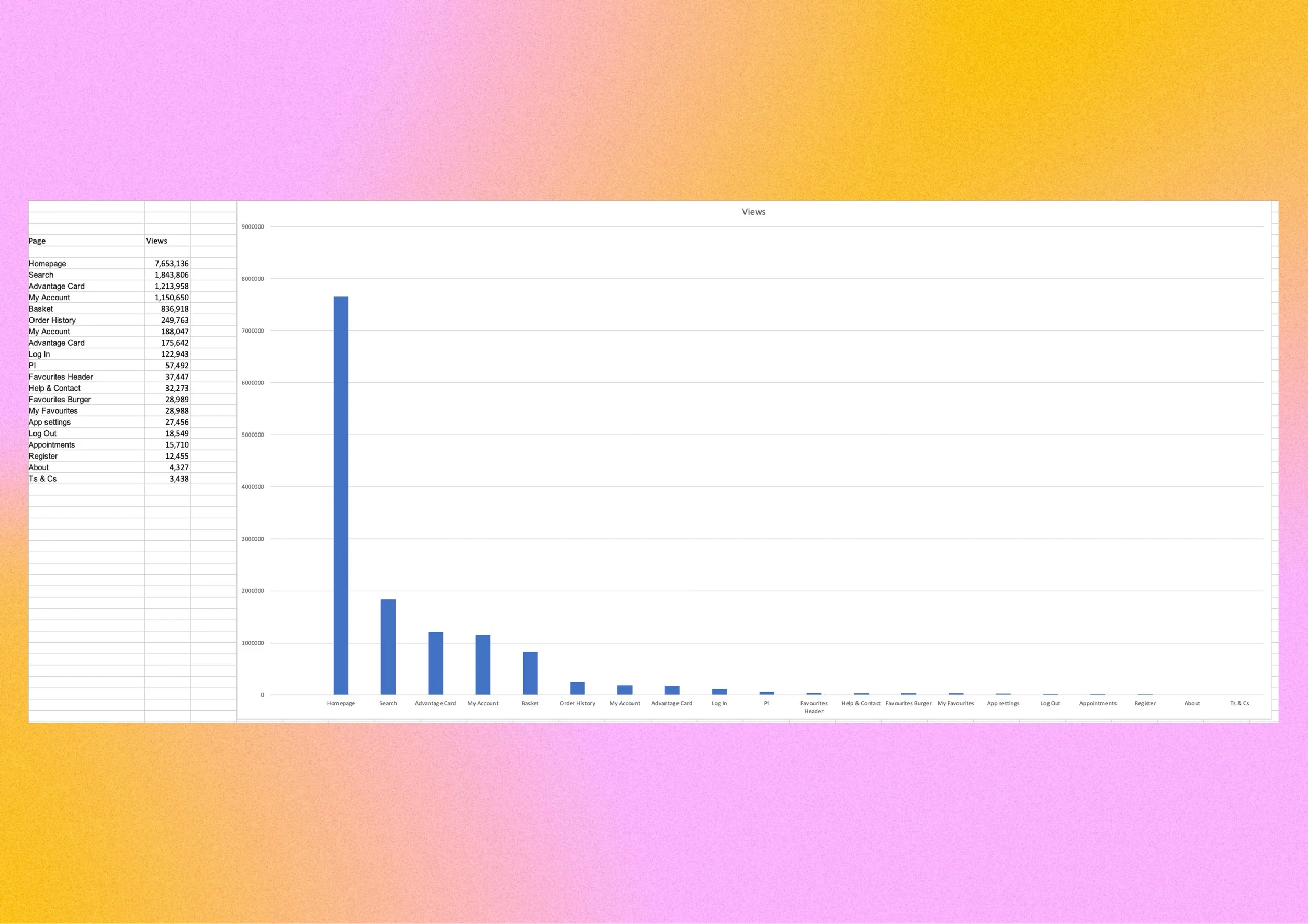 I requested data on total page views for the app, which showed that the Homepage was the most visited section. This aligns with competitor benchmarking where the Homepage was most prominently featured in the bottom navigation, followed by Search, Advantage Card, My Account, and Basket.