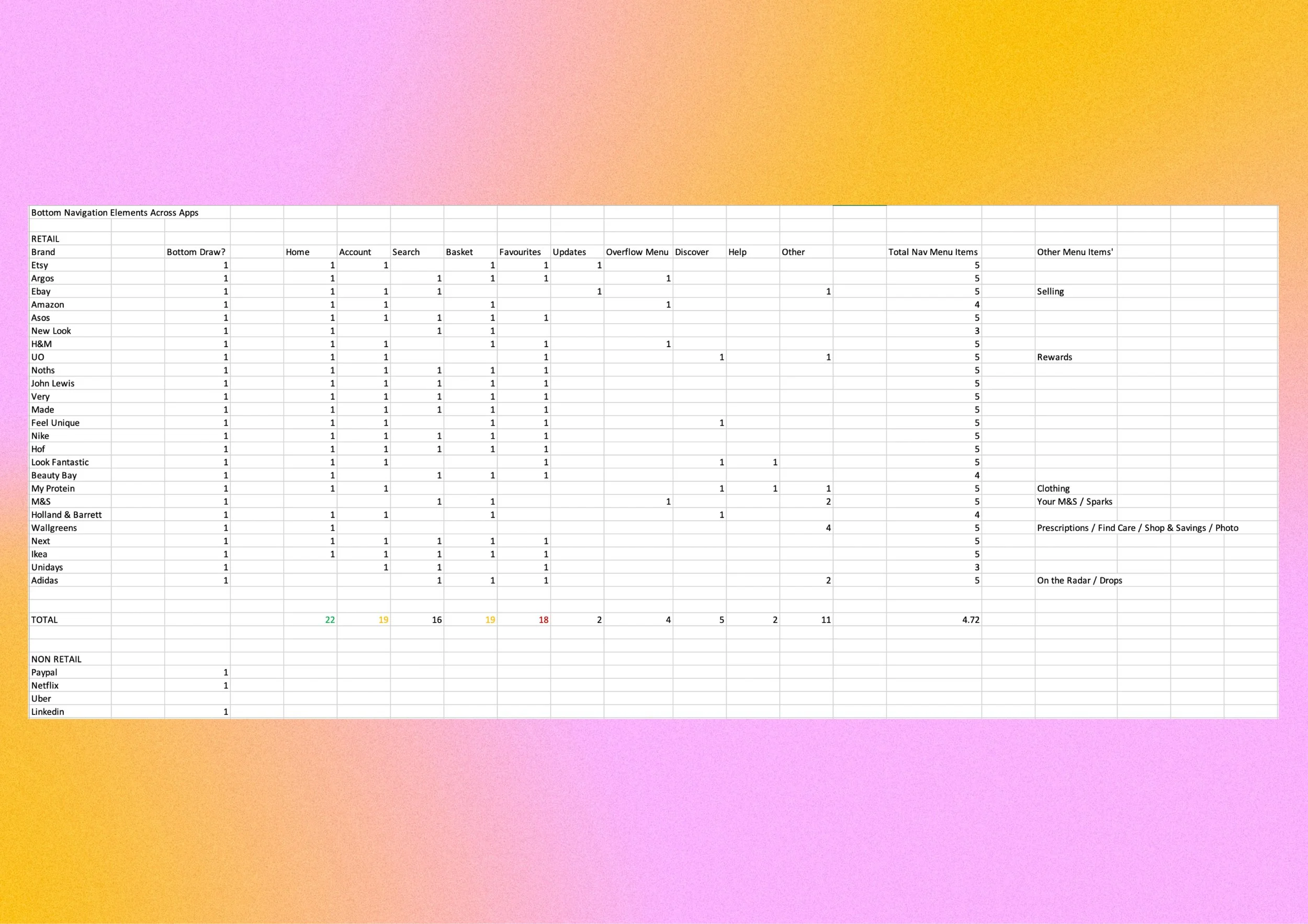 By analysing 27 competitor applications that feature a bottom navigation component, I found that it was typical to include five main sections: Home, Account, Basket, Favourites, and Search.