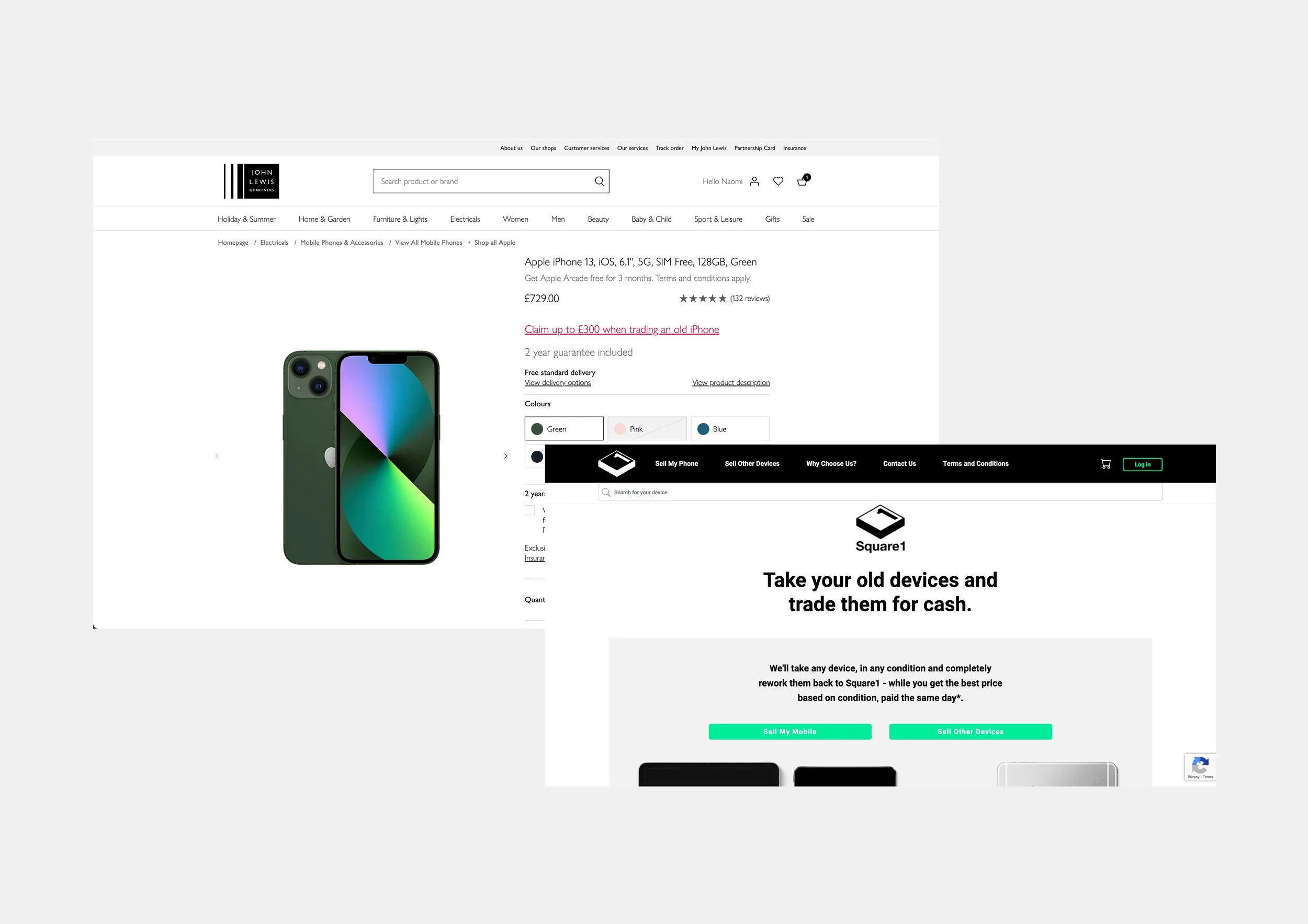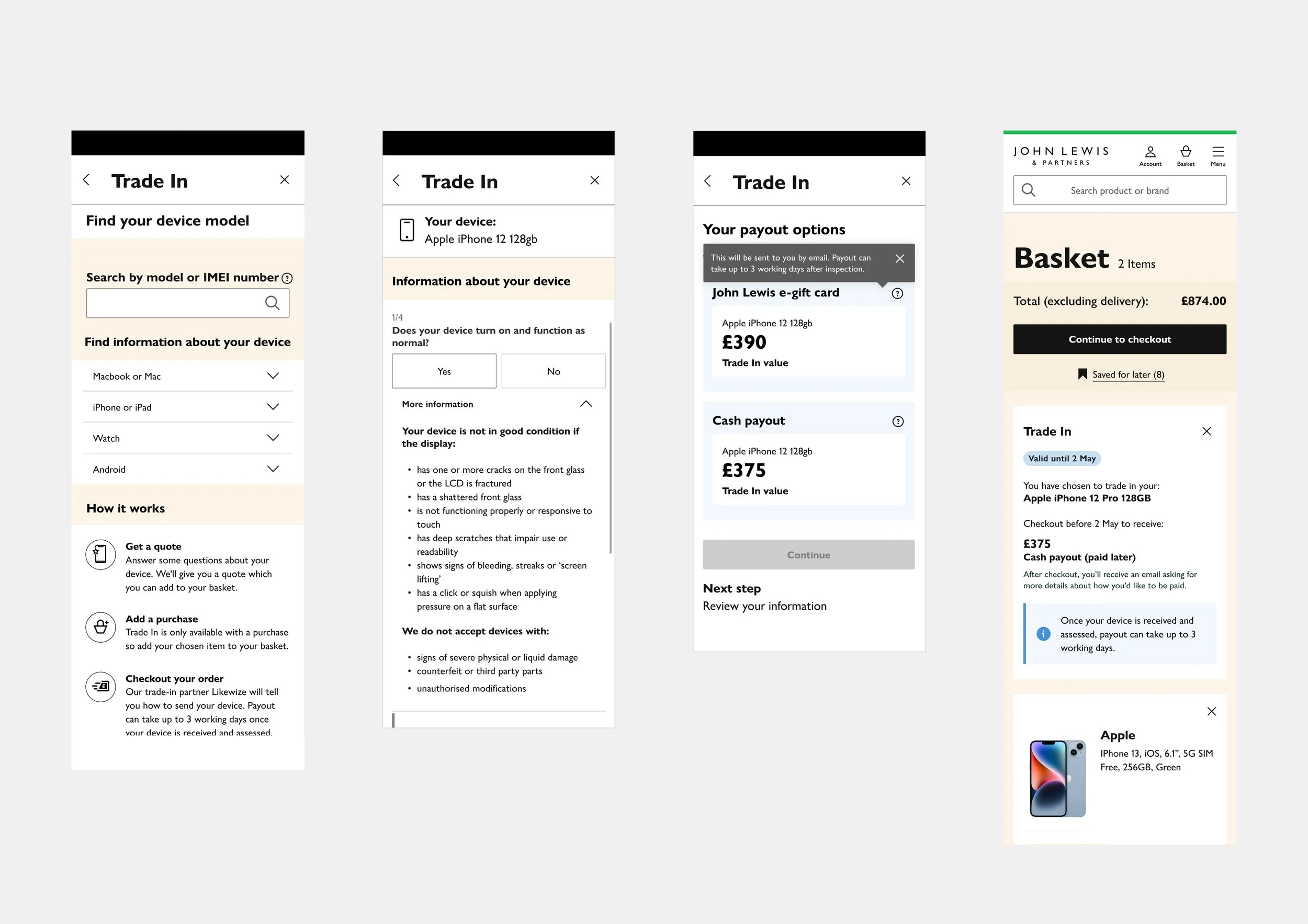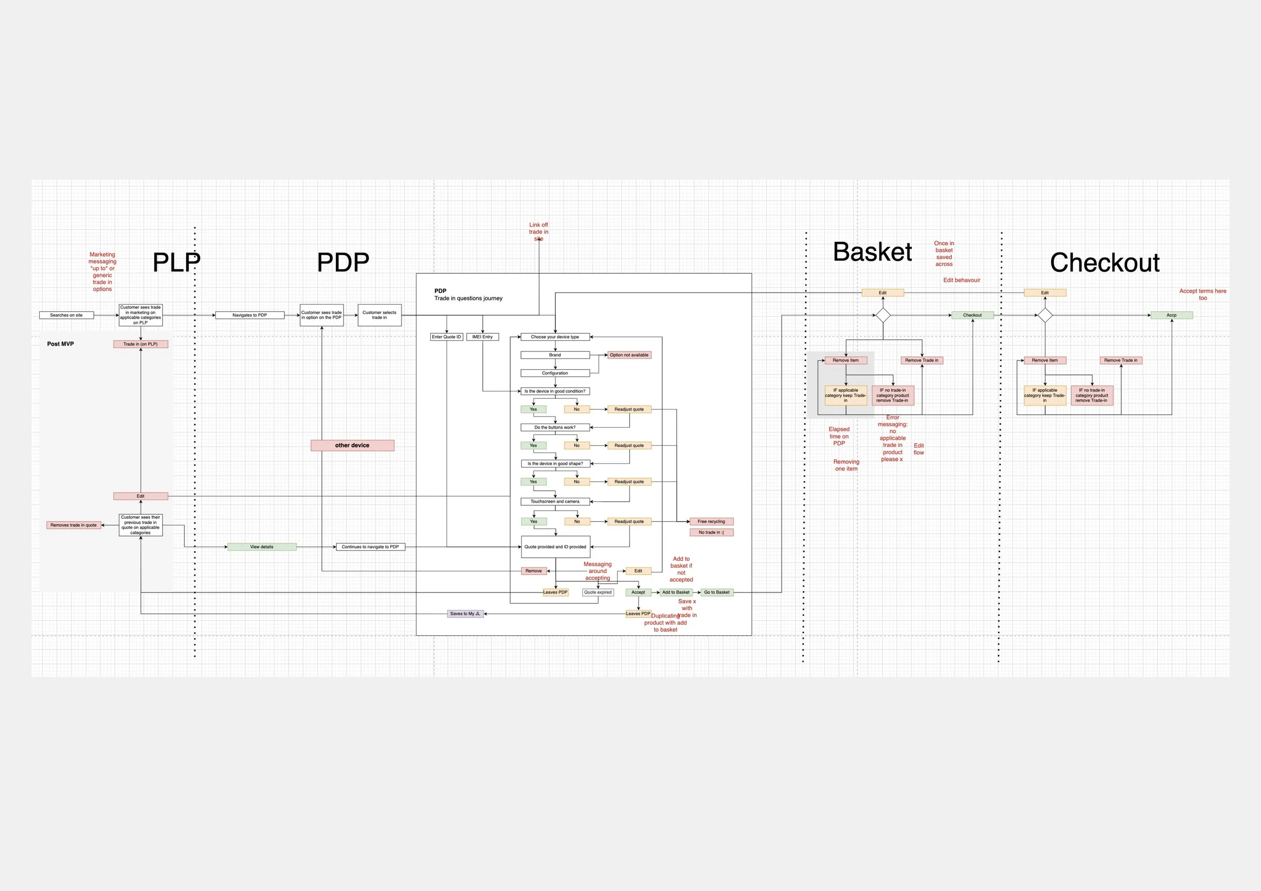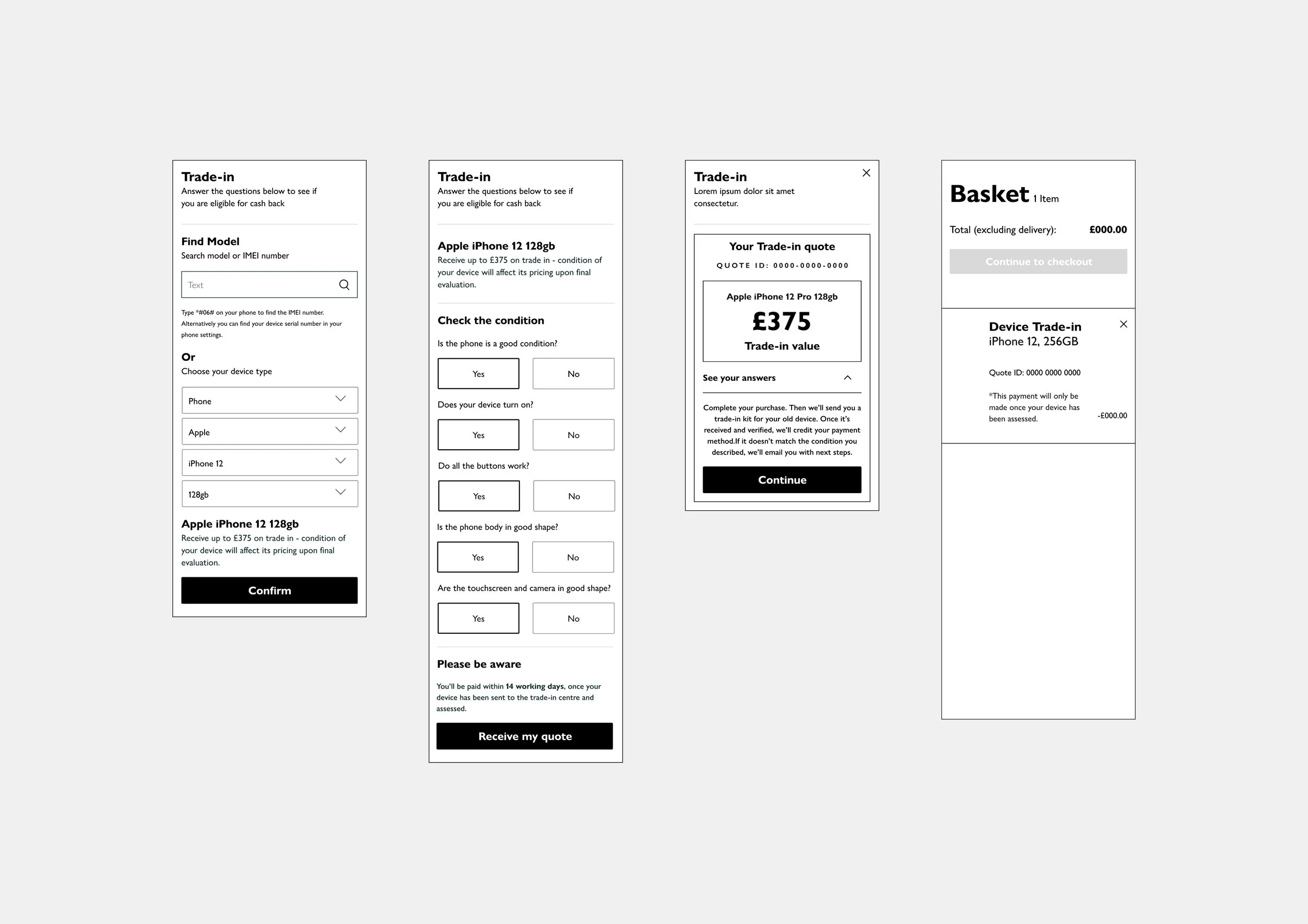 The existing trade-in service (operated by SquareOne) was complex, poorly integrated, and difficult to find in the buying process, this resulted in high abandonment rates and low customer satisfaction scores. I was tasked with leading the design development for an improved integrated trade-in proposition.